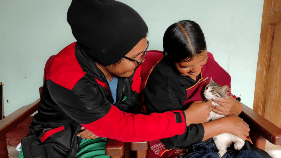 SantusaCarlosyGato ← Previous Next → Santusa Quispe de Flores sings verses to a kitten while her son Carlos looks on